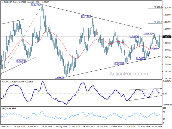 While the dip to 1.0776 was deeper than expected, EUR/USD’s subsequent strong rebound suggests that pullback from 1.0947 has completed already. Initial bias stays on the upside for retesting 1.0947 first. Firm break there will target 100% projection of 1.0665 to 1.0947 from 1.0776 at 1.1056. For now, risk will stay on the upside as long as 55 4H EMA (now at 1.0839) holds, in case of retreat.