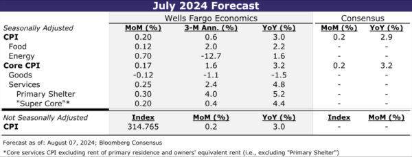 The July CPI report is likely to further the case that inflation is quieting down even if it has not yet returned all the way back to the Fed’s target. We look for headline CPI to have advanced 0.2% in July, which would keep the year-over-year rate steady at more than a three-year low of 3.0%. The core CPI also looks set to advance 0.2% in July amid a rebound in some of the more volatile “super core” components. However, we expect the step-down in shelter inflation from the first five months of the year to be sustained and for prices among core goods to continue to decline outright. If realized, the 12-month change in the core CPI would fall to a fresh cycle low of 3.2%.
