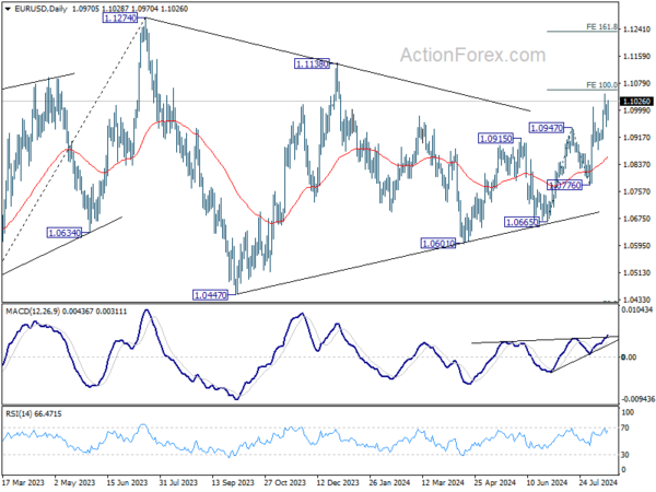 In the long term picture, a long term bottom is in place at 0.9534 (2022 low). Sustained break of 55 M EMA (now at 1.1012) will raise the chance of long term reversal. But even in this case, firm break of 1.2348 structural resistance is needed to confirm. Rejection by 55 M EMA will maintain bearishness for extend the down trend from 1.6039 (2008 high) through 0.9534 at a later stage.