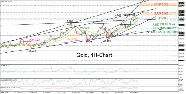 Gold lost momentum after unlocking an all-time high of 2,531 on Tuesday near the rising constraining line drawn from July’s low, but it maintained its resilience above the 2,500 psychological number by the end of the day.