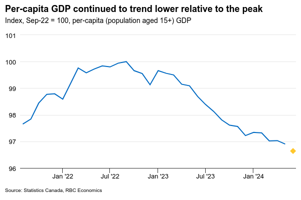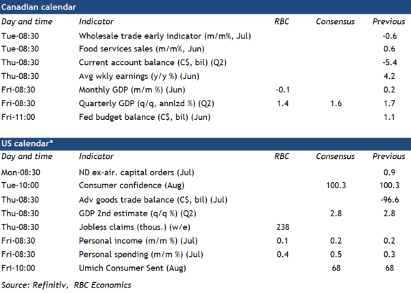 Canada’s GDP report next week is expected to show further weakening in the Canadian economy. We expect a 1.4% (annualized rate) increase in GDP in Q2 – below Statistics Canada’s 2% preliminary estimate a month ago, and marking the 7th of the last 8 quarters of declining output on a per-capita basis.