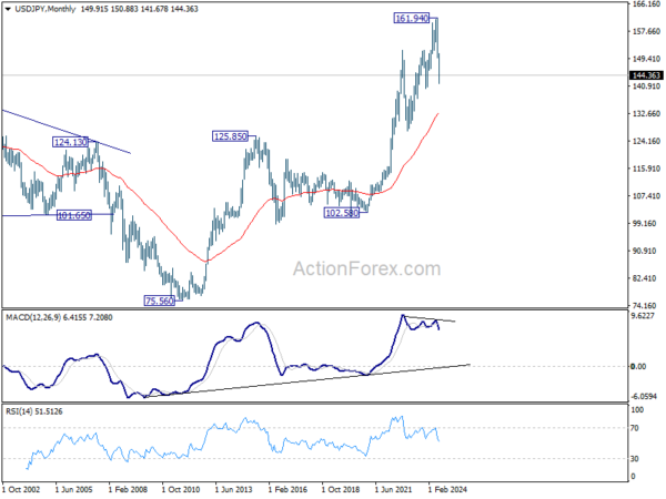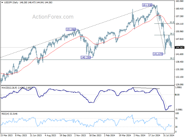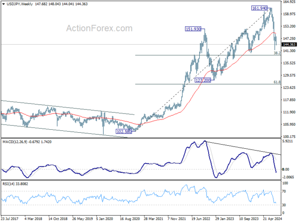 In the bigger picture, fall from 161.94 medium term top is seen as correcting whole up trend from 102.58 (2021 low). Deeper decline could be seen to 38.2% retracement of 102.58 to 161.94 at 139.26, which is close to 140.25 support. In any case, risk will stay on the downside as long as 55 W EMA (now at 149.59) holds. Nevertheless, firm break of 55 W EMA will suggest that the range for medium term corrective pattern is already set.