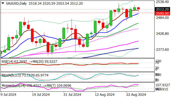Deeper pullback below $2500 should be contained above $2470/64 (Aug 22 higher low / ascending 20DMA) to keep bulls intact and offer better levels to re-join bullish market.