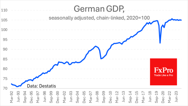 The final reading confirmed a 0.1% contraction in the German economy in the second quarter, with a modest growth of 0.3% y/y and stagnation close to the same level of March 2022, just 0.3% above the 2019 peak vs 9.3% in the US over the same period.