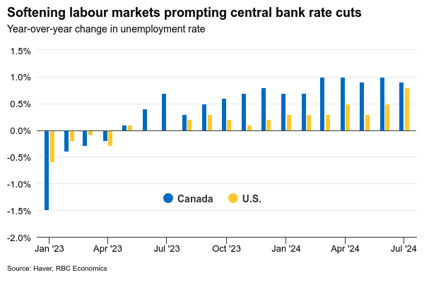 While the decision for the BoC to pivot to lower interest rates this year was likely relatively easy, the economic backdrop for the U.S. Federal Reserve has been more complicated. Resilient U.S. GDP growth and a flare-up in inflation pressures earlier this year has kept the Fed on the sidelines for longer than other advanced economies. But a downside surprise in U.S. labour market data in July jolted worries that a feared more significant labour market slowdown may have started, with a rise in the unemployment rate breaching thresholds usually only seen during U.S. recessions (the so-called ‘Sahm’ rule.)