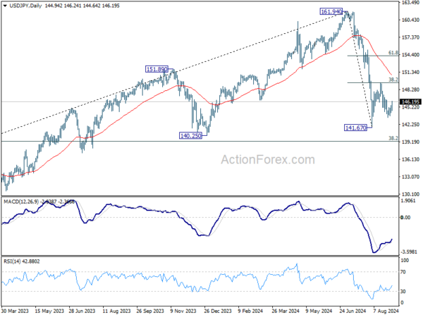 In the bigger picture, fall from 161.94 medium term top is seen as correcting whole up trend from 102.58 (2021 low). Deeper decline could be seen to 38.2% retracement of 102.58 to 161.94 at 139.26, which is close to 140.25 support. In any case, risk will stay on the downside as long as 55 W EMA (now at 149.47) holds. Nevertheless, firm break of 55 W EMA will suggest that the range for medium term corrective pattern is already set.