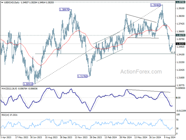 Intraday bias in USD/CAD remains neutral at this point. Some more consolidations would be seen above 1.3439, and stronger recovery cannot be ruled out. But further decline is expected as long as 1.3617 resistance holds. Break of 1.3439 and sustained trading below 61.8% retracement of 1.3091 to 1.3946 at 1.3418 will pave the way to 1.3091/3176 support zone next.