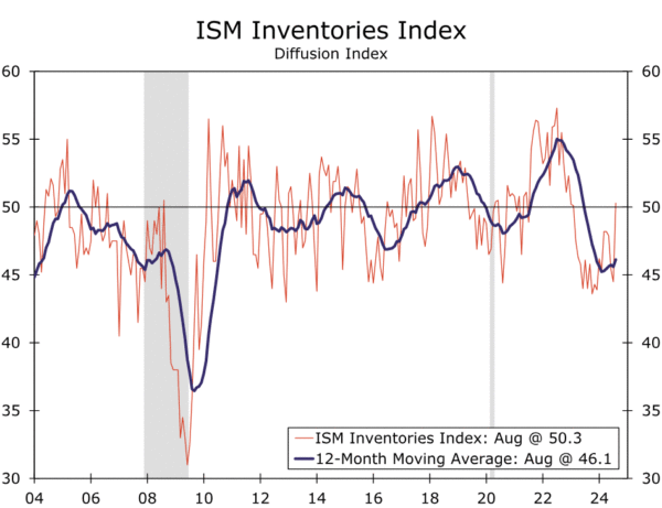 Slower activity continues to hold back hiring. We often look to the ISM surveys for a hint of what to expect from the coming employment report, and although the ISM’s have been more volatile than broader hiring figures, the signal has been clearly one of lost momentum. While employment was less negative in August, it was still consistent with a broad contraction in hiring in August. Only three of 18 industries reported employment growth in August according to the release, and one of them (food & beverage) was said to do so due to seasonal reasons. The employment component has only been above 50, or consistent with an expansion in hiring, for just one month of the year.