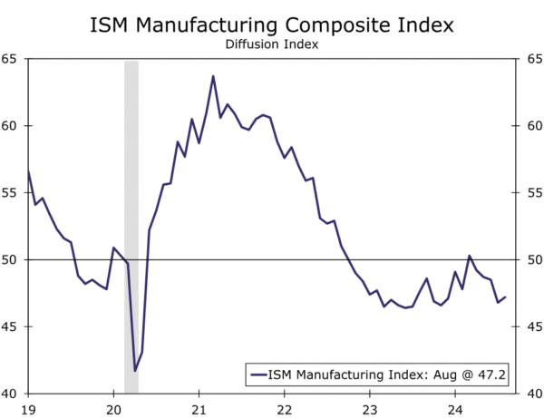 Our way of describing this dichotomy has been that the combination of pulled-forward demand for durable goods during the pandemic and higher financing costs has meant that Fed rate hikes have bitten harder in this sector than most others. Both of these dynamics are transitioning in a way that we expect to eventually be favorable for the sector. Even long-lived durable goods need replacing and items purchased during the early days of the pandemic are now four-and-a-half years old and rates are apt to start coming down, perhaps as soon as later this month. But for August, it was more of the same for manufacturing.