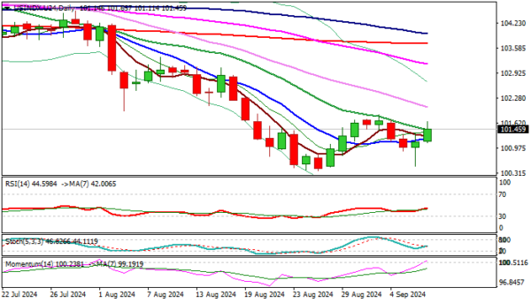 Technical picture improved on daily chart, as north-heading 14- momentum broke into positive territory and the price rose above converging 10/20DMA’s, with the action being underpinned by long-tailed Friday’s candlestick which points to strong bids.