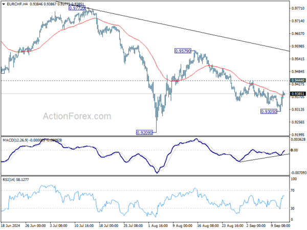 As for EUR/CHF, a temporary low should be formed at 0.9305 with current recovery. But further decline is expected as long as 0.9444 resistance holds. Below 0.9305 will resume the fall from 0.9579 to retest 0.9209 low. Firm break there will resume larger down trend. However, decisive break of 0.9444 will argue that the pullback from 0.9579 has completed as a corrective move. In this case, rise from 0.9209 could be resume to resume through 0.9579 resistance instead.