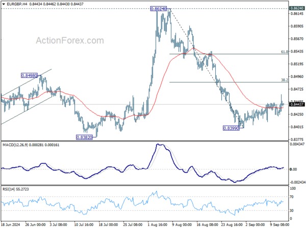 Technically, EUR/GBP’s price actions from 0.8399 short term bottom are still corrective looking. While stronger recovery might be seen, upside should be limited by 38.2% retracement of 0.8624 to 0.8399 at 0.8485. Break of 0.8399 will bring retest of 0.8382 low. Firm break there will resume larger down trend. However, sustained break of 0.8485 will bring stronger rally to 61.8% retracement at 0.8538 and possibly above.