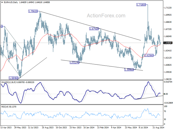 In the bigger picture, outlook is mixed up by the deeper than expected fall from 1.7180. Yet as long as 1.5996 support holds, up trend from 1.4281 (2022 low) is still expected to resume at a later stage. Firm break of 1.7180 will pave the way to 61.8% projection of 1.4281 to 1.7062 from 1.5996 at 1.7715.
