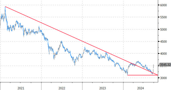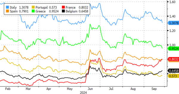 European trading mostly revolved around China’s Politburo promise of more forceful cuts, necessary fiscal spending and vow to stabilize the ailing real estate market in late Asian trading dealings this morning. It fired up stock markets, in particular Chinese. The CSI300 jumped another 4%+ and is headed for its biggest weekly gain in a decade. European markets bathed in the positive spillovers with the likes of the EuroStoxx50 eking out gains of >2% and the Stoxx600 bracing for a record close. The AUD and NZD are the best performers in currency markets. Their respective countries have important trade ties with China. German Bunds outperformed in core bond markets. German yield changes vary between -2.4 (30-yr) and -3.0 bps (2-yr) with the 2-yr testing the recent/March 2023 lows. The French spread vs. Germany’s 10-yr yield is grabbing some headlines. Growing risk premia push it above the Spanish one for the first time since 2007 (80 bps vs 79 bps). Investors increasingly worry about France’s fiscal mess and the inability of a frail coalition government to do something about it. US Treasuries swapped earlier gains for losses after the release of some second tier data. US durable goods orders topped estimates across the board, both on a headline level (0.5% vs -2.6% expected) and in the different core gauges. Shipments – used as a proxy for investment in GDP calculations – came in at the expected 0.1%. Weekly jobless claims eased from 222k to 218k, the lowest since May, defying expectations for an increase to 223k. US yields reversed earlier losses to trade +3 bps (2-yr) higher and flat at the back end ahead of what could have been a potential market mover: Fed chair Powell’s pre-recorded speech at the 10th annual US Treasury Market Conference. “Could have”, since Powell did not touch on monetary policy nor did he comment the economic outlook.