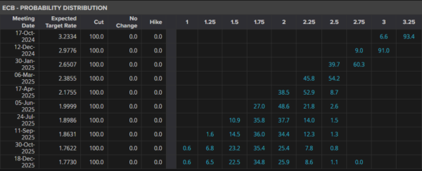 Markets are now pricing in around six consecutive rate cuts from the ECB starting in October. A 25 bps cut in October is now priced at around 93% which is a stark increase from where we were a month ago.