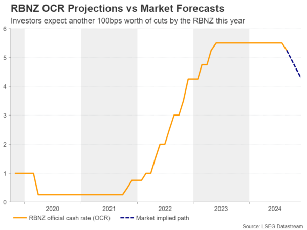 The decision to cut rates came one year ahead of the Bank’s previous forecasts, with the new ones projecting the cash rate at 4.9% in the fourth quarter of 2024. However, investors took a more aggressive stance just after the decision, penciling in more than 30bps worth of cuts for the October decision.