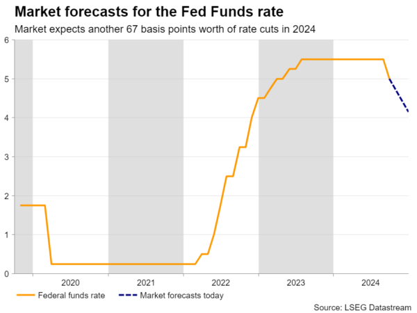 Thus, barring any further escalation in the Middle East, dollar traders are likely to keep their gaze locked on the economic calendar. On Wednesday, the minutes of the latest FOMC decision are due to be released. Nonetheless, given that the dot plot pointed to 50bps worth of rate reductions by the end of the year and that most policymakers who spoke after the decision, including Chair Powell, favored quarter-point reductions from here onwards, the minutes are unlikely to shake the markets.