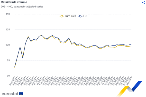 In the wider EU, retail sales grew by 0.3% month-on-month. Luxembourg led the gains with a 5.3% increase in total retail trade volume, followed by Cyprus at 2.2% and Romania at 1.6%. On the downside, Denmark saw the steepest drop at -1.5%, while Slovakia, Bulgaria, and Croatia also posted declines in retail trade volume.