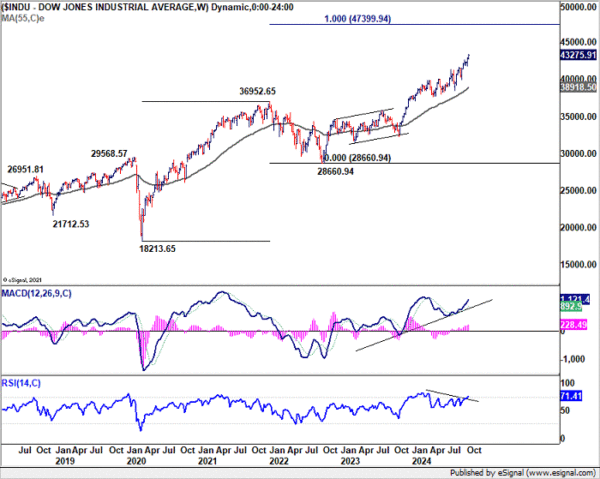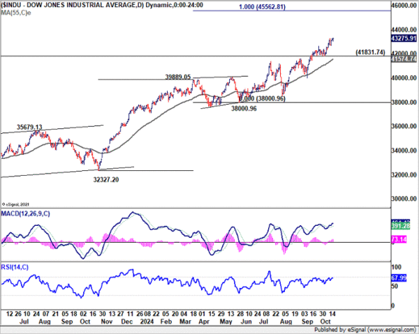 As for DOW, near term outlook will remain bullish as long as 41831.74 support holds. Next target is 100% projection of 32327.20 to 3989.05 from 38000.96 at 45562.81. Also, while it’s still a bit far, we’d pencil in 100% projection of 1821365 to 36952.65 from 28660.94 as the next medium term target first.