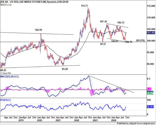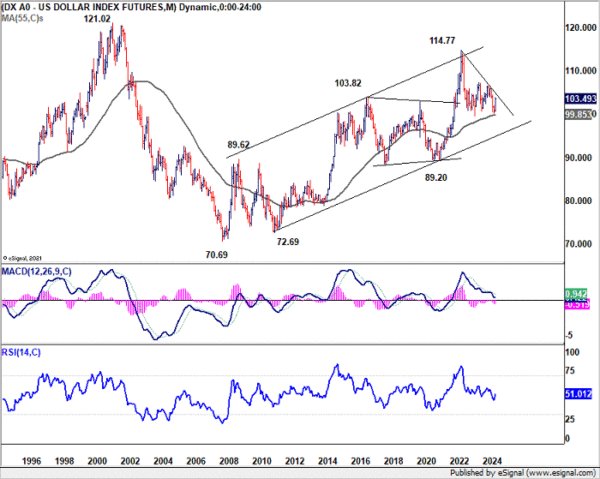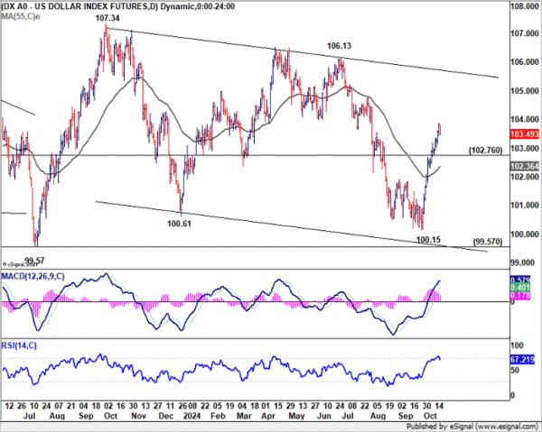 Dollar index is also pressing 55 W EMA (now at 103.47). Break of 102.76 minor support will indicate initial rejection by 55 W EMA and bring pull back to 55 D EMA (now at 102.36) and possibly below. However, considering that DXY has just bounced of 55 M EMA (now at 99.85). Sustained break of 55 W EMA will raise the chance that whole corrective fall from 114.77 has completed, and bring stronger rally to 106.13/107.34 resistance zone.