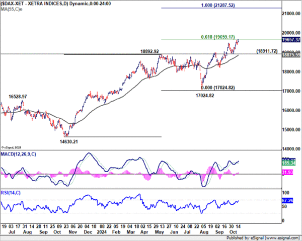 Nevertheless, firm break of 20k will be a sign of strong underlying momentum. Next near term target will be 100% projection of 14630.21 to 18892.92 from 17024.82 at 21287.52.