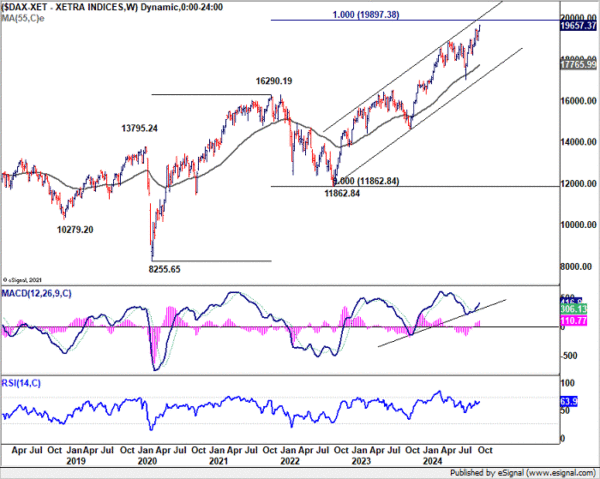 Technically, DAX is now close to 100% projection of 8255.65 (2020 low) to 16290.19 (2021 high) from 11862.84 (2022 low) at 19897.38, which is close to 20k psychological level. Break of 18911.72 support will indicate initial rejection by this resistance zone, and bring break deeper pullback towards 17024.82 support.