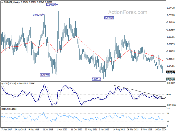 Technically, while EUR/GBP’s down trend resumed last week it’s now heading towards an important support at 0.8201 (2022 low). Strong support is expected there to contain downside and bring rebound, at least on first attempt. Break of 0.8433 resistance should turn the cross into sideway trading first. But medium term outlook will remain bearish as long as 0.8624 resistance holds.