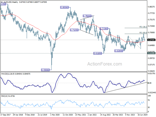 In the bigger picture, overall, price actions from 0.6169 (2022 low) are seen as a medium term corrective pattern, with rise from 0.6269 as the third leg. Firm break of 100% projection of 0.6269 to 0.6870 from 0.6340 at 0.6941 will target 138.2% projection at 0.7179. However, break of 0.6621 support will argue that rise from 0.6269 has completed and bring deeper fall back to 0.6269/6348 support zone.