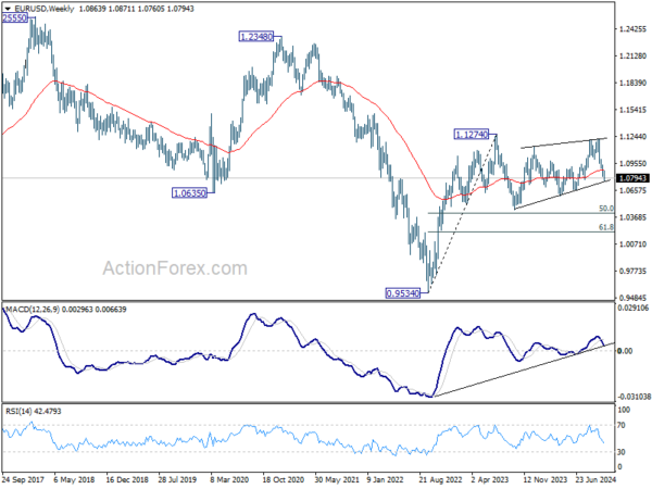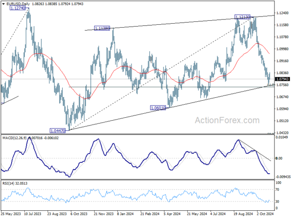In the bigger picture, price actions from 1.1274 (2023 high) are seen as a consolidation pattern to up trend from 0.9534 (2022 low), with fall from 1.1213 as the third leg. Downside should be contained by 50% retracement of 0.9534 (2022 low) to 1.1274 at 1.0404, to bring up trend resumption at a later stage.