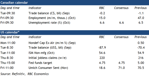 We think Friday’s Canadian employment report should tell a familiar story—that the labour market has continued to weaken in October amid slowing hiring demand. Employment is still expected to increase, but not by much. We expect 15,000 jobs were added, but that would again undershoot growth in the labour force and population, and push the unemployment rate back up to 6.6% after a tick lower to 6.5% in September.