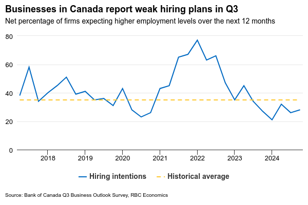 Leading indicators for employment conditions in Canada are still sending weak signals. Job openings have already dropped below pre-pandemic levels, and are still plunging. Business hiring intentions, according to the Bank of Canada’s latest Business Outlook Survey, have remained soft in Q3 driven by a subdued sales outlook over the next 12 months. Looking forward, we think unemployment will continue to rise in Canada to 7% by early 2025 before trending lower on a recovery in hiring demand.