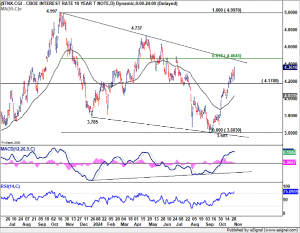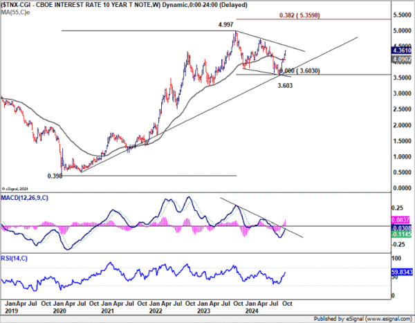 Technically, near term outlook in 10-year yield will stay bullish as long as 4.178 support holds. Rise from 3.603 is in progress to 61.8% retracement of 4.997 to 3.603 at 4.464. Decisive break there will solidify the case that fall from 4.997 has completed as a corrective three-wave move to 3.603. Further rally should then be seen to 4.737 next.
