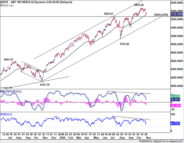 After the gap down on Thursday and subsequent selloff, immediate focus in S&P 500 is now on 5669.67 resistance turned support. Considering bearish divergence condition in D MACD, firm break of 5669.67 and sustained trading below 55 D EMA (now at 5695.63) will confirm medium term topping. Deeper fall would then be seen to channel support at around 5465, even as a correction rather then reversal.