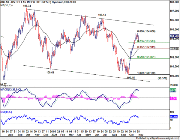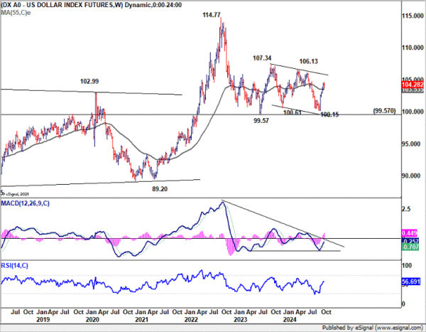 With 23.6% retracement of 100.15 to 104.63 at 103.57 in Dollar Index intact, consolidations from 104.63 should be relatively brief. Break of 104.63 will resume the rally from 100.15 to 106.13 resistance.