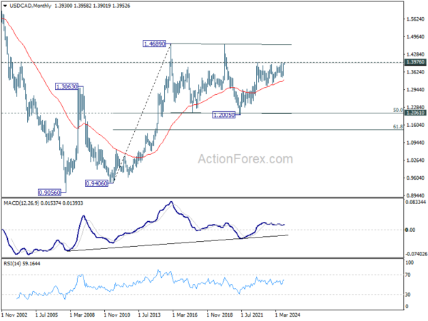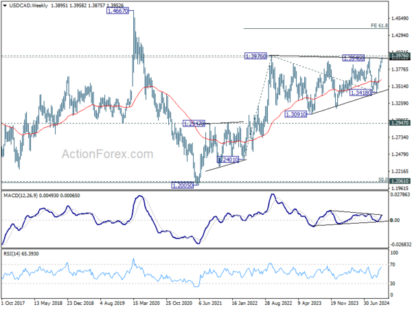 USD/CAD’s rally from 1.3418 continued last week and there is no clear sign of topping yet. Initial bias remains on the upside for 1.3976 resistance. Decisive break there will resume larger up trend. Nevertheless, considering bearish divergence condition in 4H MACD, break of 1.3890 minor support will indicate short term topping, and turn bias back to the downside for deeper pullback.