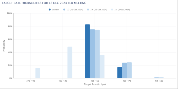 Market expectations for Fed’s policy easing remained largely unchanged after the slew of data last week. Fed funds futures indicate a 98.9% probability of a 25 bps rate cut to 4.50-4.75% at the November 7 meeting. The chance of an additional 25 bps cut to 4.25-4.50% stands at 82.7%, slightly higher than the 74.6% probability a week ago.