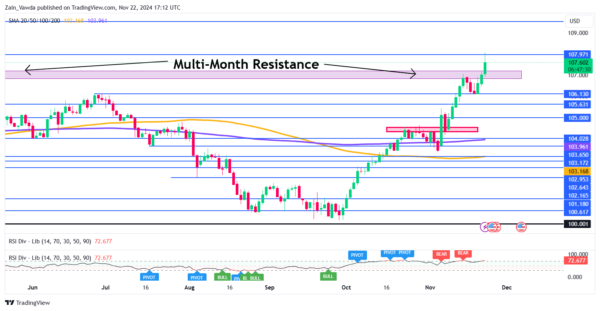 This week’s focus remains the US Dollar Index (DXY), which has taken out a key multi-month resistance level at the 107.00 handle rising to a high of around 108.00 before a pullback.