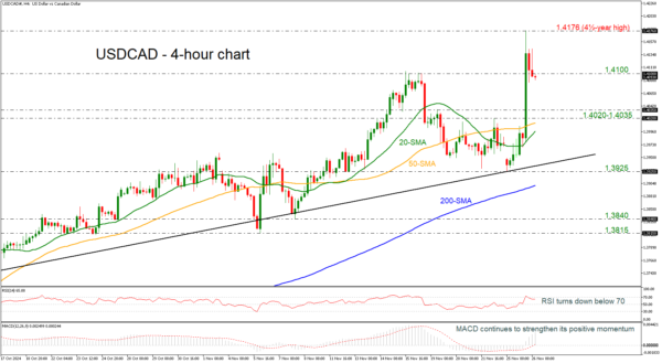 USDCAD has successfully broken the 1.4100 psychological mark earlier today, taking the market towards a fresh four-and-a-half-year high of 1.4176. The price rose around 1.5% only in just one 4-hour session but is currently turning lower.