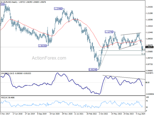 In the bigger picture, focus stays on 50% retracement of 0.9534 (2022 low) to 1.1274 at 1.0404. Strong rebound from this level will keep price actions from 1.1273 (2023 high) as a medium term consolidation pattern only. However, sustained break of 1.0404 will raise the chance that whole up trend from 0.9534 has reversed. That would pave the way to 61.8% retracement at 1.0199 first. Firm break there will target 0.9534 low again.