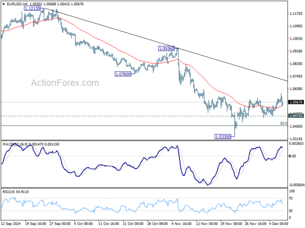 EUR/USD’s rebound from 1.0330 short term bottom extended higher last week. Initial bias is mildly on the upside this week for further rise to 55 D EMA (now at 1.0729). But strong resistance could be seen there to limit upside. On the downside, break of 1.0471 minor support will turn bias to the downside for retesting 1.0330 low. Firm break of 1.0330 will resumed the decline from 1.1213, and sustained trading below 1.0404 key fibonacci level will carry larger bearish implication.