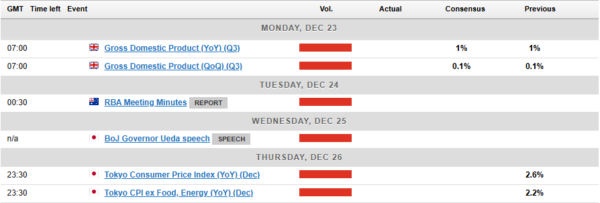 In developed markets, it is a quiet week as well with the biggest data release being UK GDP Q3 data due out on Monday. The UK has a bank holiday on December 26 along with a host of other countries which makes the week a short one as well.