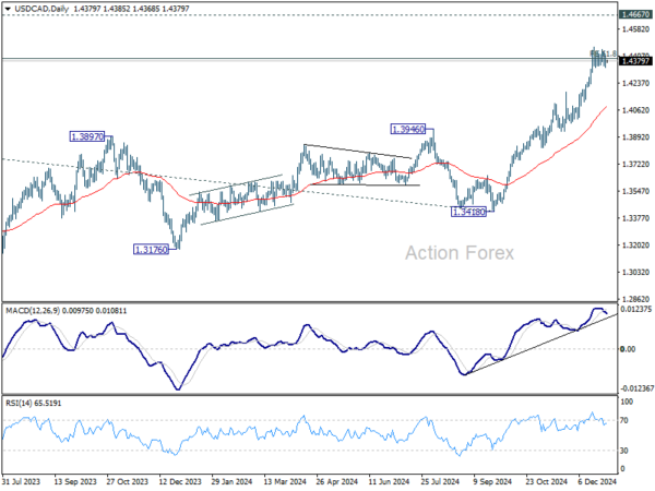 Intraday bias in USD/CAD remains neutral as consolidations continue below 1.4466. Deeper pullback cannot be ruled out, but outlook will stay bullish as long as 1.4177 resistance turned support holds. On the upside, break of 1.4466 and sustained trading above 1.4391 will pave the way to retest 1.4667/89 long term resistance zone.