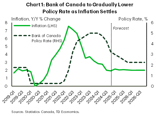 The Bank of Canada (BoC) kicked off their easing cycle in June 2023, delivering a cumulative 175 basis point (bps) of cuts to date, bringing the policy rate to 3.25% which is the upper end of its neutral target range. With inflation having settled at around 2%, the BoC has signaled a more gradual pace of easing in 2025. At present, we expect the BoC to continue lowering the policy rate, to the tune of 25 bps per quarter, landing at 2.25% by end-2025 (Chart 1). The goal for the BoC now is to follow a rate path supportive enough to balance downside risks to growth while keeping inflation at bay.