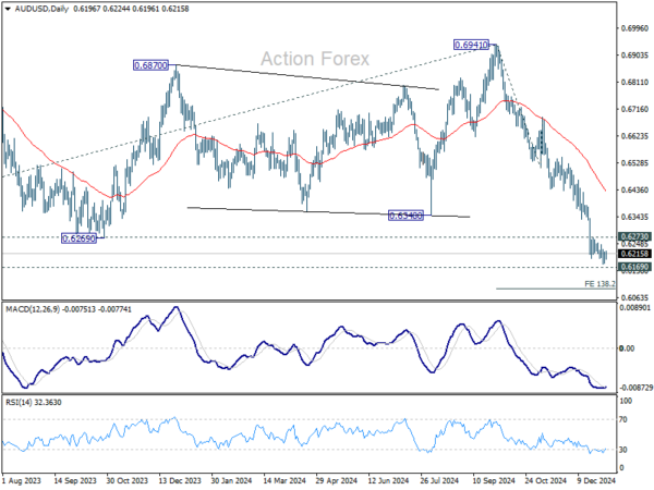 AUD/USD edged lower last week but lost momentum just ahead of 0.6169 key support. Further decline remains in favor as long as 0.6273 resistance holds. Decisive break of 0.6169 will target 138.2% projection of 0.6941 to 0.6511 from 0.6687 at 0.6074. However, considering bullish convergence condition in 4H MACD, break of 0.6273 resistance will indicate short term bottoming, and turn bias back to the upside for stronger rebound.