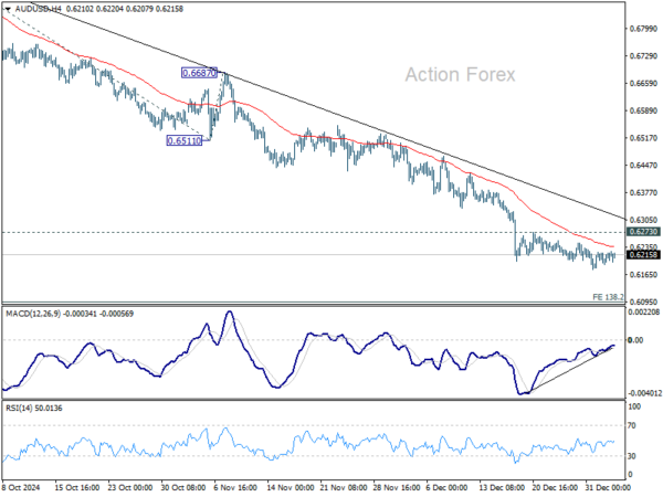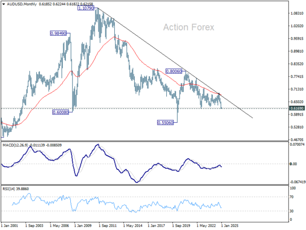 In the bigger picture, price actions from 0.6169 (2022 low) are seen as a medium term consolidation to the down trend from 0.8006, and could have completed at 0.6941 already. Firm break of 0.6169 support will confirm down trend resumption for 61.8% projection of 0.8006 to 0.6169 from 0.6941 at 0.5806 next. In any case, outlook will stay bearish as long as 55 W EMA (now at 0.6587) holds.