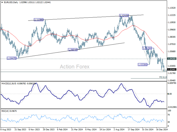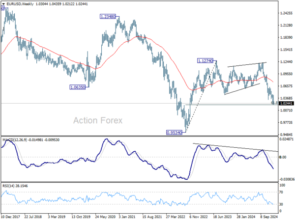In the bigger picture, fall from 1.1274 (2023 high) should either be the second leg of the corrective pattern from 0.9534 (2022 low), or another down leg of the long term down trend. In both cases, sustained break of 61.8 retracement of 0.9534 to 1.1274 at 1.0199 will pave the way back to 0.9534. For now, outlook will stay bearish as long as 1.0629 resistance holds, even in case of strong rebound.
