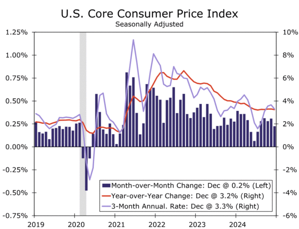 That said, when looking through the month-to-month noise, the inflation data have been fairly stubborn in recent months, neither gathering nor losing speed. The 12-month change in the core CPI (+3.2%) is more or less the same as the three-month annualized rate (3.3%). The picture looks a bit better for the Fed’s preferred inflation metric, the core PCE deflator, where we project December inflation to be 0.2% month-over-month and 2.8% year-over-year. But, this marks only a modest slowdown relative to the 3.0% core PCE inflation registered in December 2023, and it is still well above the central bank’s 2% inflation target.