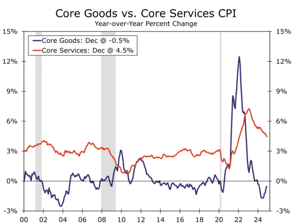 Core services prices increased 0.3%—in line with November. Primary rent growth (owners’ equivalent rent and primary rent) reverted to its recent trend of 0.3% after slowing sharply in November. But excluding housing, core services advanced 0.2% amid more modest gains in medical care and other services like recreation, tuition and personal care.