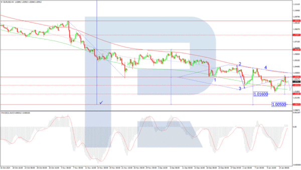 On the H4 chart, EUR/USD completed a corrective wave to 1.0350 before forming a new downward impulse to 1.0258. The current outlook suggests the potential development of a new downward wave targeting 1.0160. After reaching this level, a corrective move towards 1.0250 is likely, with a possible further decline to 1.0050. This scenario is supported by the MACD indicator, with its signal line below zero and trending downwards, indicating the likelihood of renewed lows.