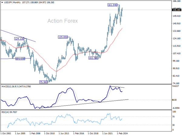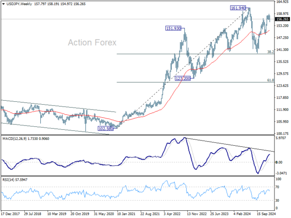 USD/JPY’s extended fall last week confirmed short term topping at 158.86. But as a temporary low was formed at 154.97, initial bias is neutral this week first. Risk will stay on the downside as long as 158.86 resistance holds, in case of stronger recovery. Below 154.97 will target 55 D EMA (now at 154.53). Sustained break there will target 38.2% retracement of 139.57 to 158.86 at 151.49 next.
